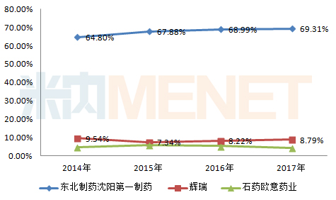 從2017年的數據看,東北制藥以69.31%的市場(chǎng)份額位居首位,原研廠(chǎng)家輝瑞以8.79%的比例緊接其后。從近幾年各大品牌的市場(chǎng)份額變化看,東北制藥基本呈現穩定增長(cháng)的態(tài)勢,輝瑞的市場(chǎng)份額則有所波動(dòng)。
