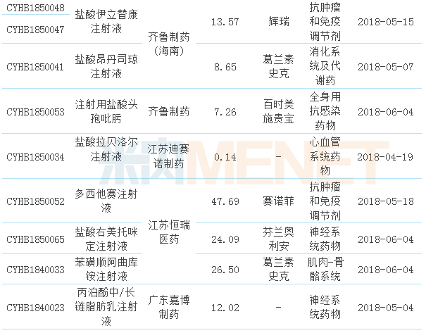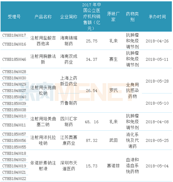 從治療類(lèi)別看,14個(gè)品種中有5個(gè)為抗腫瘤和免疫調節劑,可見(jiàn)抗腫瘤領(lǐng)域是藥企們申報的重點(diǎn),消化系統及代謝、神經(jīng)系統藥物、全身抗感染藥物均有2個(gè)產(chǎn)品;從產(chǎn)品的申報廠(chǎng)家看,齊魯制藥及子公司申報的產(chǎn)品最多;從申報的產(chǎn)品看,除了注射用頭孢曲松鈉有2家企業(yè)同時(shí)申報外,其他品種均只有1家企業(yè)申報;從產(chǎn)品的銷(xiāo)售額看,2017年在公立醫療機構終端銷(xiāo)售額超過(guò)10億元的產(chǎn)品有11個(gè)(超過(guò)20億元的有8個(gè)),其中注射用泮托拉唑鈉接近90億元,注射用培美曲塞二鈉及多西他賽注射液接近50億元。