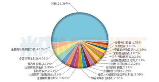 截至目前,申報一致性評價(jià)的抗腫瘤產(chǎn)品在2017年中國公立醫療機構終端抗腫瘤和免疫調節劑的競爭格局中均處于主導地位,注射用培美曲塞二鈉以4.13%的比例位居首位,多西他賽注射液以4.09%的比例緊接其后,注射用胸腺法新以2.95%的比例排位第四。