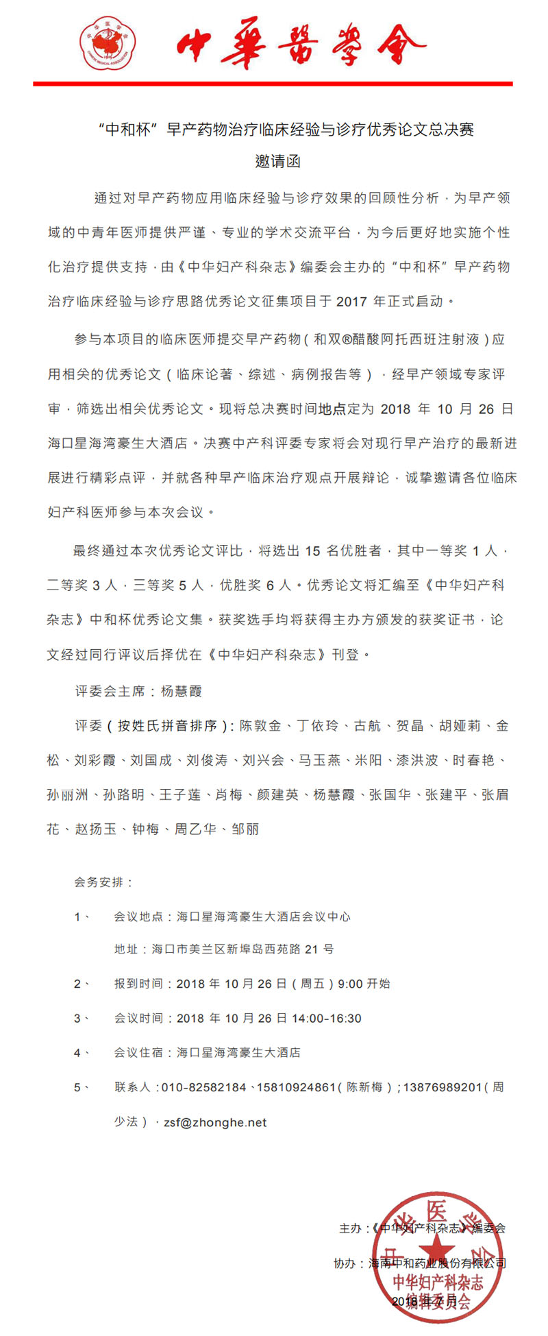 “中和杯”早產(chǎn)藥物治療臨床經(jīng)驗與診療優(yōu)秀論文總決賽邀請函