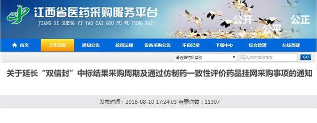 8月10日,江西省發(fā)布《關(guān)于延長(cháng)“雙信封”中標結果采購周期及通過(guò)仿制藥一致性評價(jià)藥品掛網(wǎng)采購事項的通知》,對通過(guò)一致性評價(jià)的藥品采購做出了政策支持: