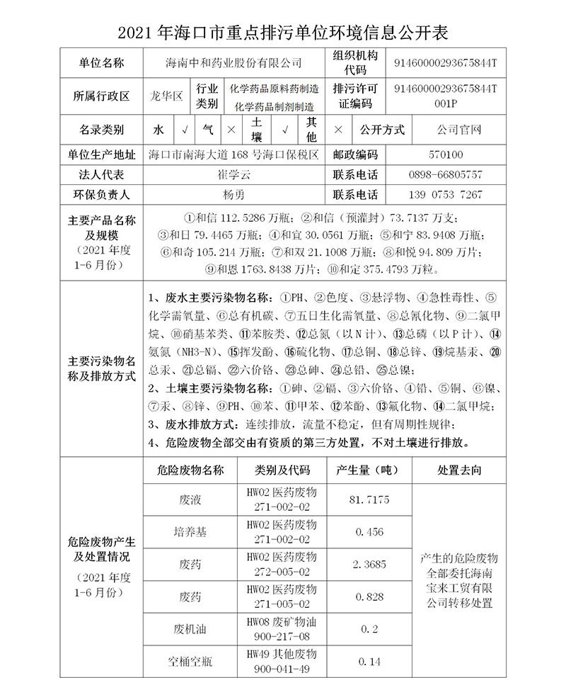 海南中和藥業(yè)--2021年??谑兄攸c(diǎn)排污單位環(huán)境信息公開(kāi)表