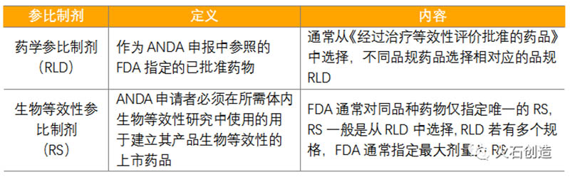 來(lái)源:根據公開(kāi)資料整理 在1984年美國《藥品價(jià)格競爭和專(zhuān)利期修正法》(Hatch—Waxman法案)通過(guò)之前,仿制藥的審批程序與原研藥基本相同,仿制藥上市前需要與原研藥開(kāi)展相等的安全性和有效性等研究,導致仿制藥上市時(shí)間滯后、成本居高不下。Hatch—Waxman法案則極大地簡(jiǎn)化了仿制藥上市審批程序,仿制藥企業(yè)無(wú)需提交全面的臨床研究資料,只需證明仿制藥與原研藥具有生物等效性即可,稱(chēng)為簡(jiǎn)略新藥申請(Abbreviated New Drug Application,ANDA)。此外,FDA還建立了仿制藥生物等效性的具體指南數據庫,為仿制藥企業(yè)開(kāi)展生物等效性研究提供指導和幫助。 (二)參比制劑 為了避免仿制藥與原研藥在療效上出現偏差,FDA規定了相同化學(xué)成分藥物的參比制劑,仿制藥只能將該參比制劑作為評價(jià)體內或體外治療等效性的標準藥物。仿制藥與參比制劑應具有相同的活性成分、劑型、規格、給藥途徑和說(shuō)明書(shū)。FDA將仿制藥參比制劑分為藥學(xué)參比制劑(reference listed drug,RLD)和生物等效性參比制劑(reference standard,RS)。 表1:美國仿制藥參比制劑