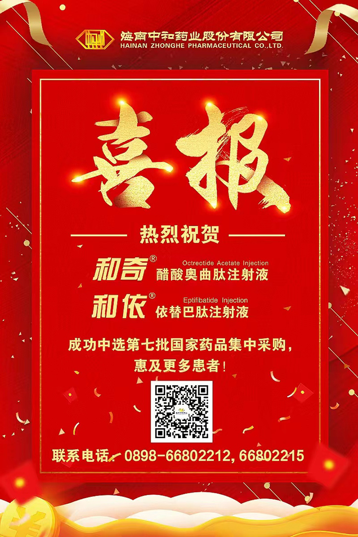 2022年7月12日,在國家醫保局等相關(guān)部門(mén)組織和指導下,全國各省份組成采購聯(lián)盟開(kāi)展第七批國家組織藥品集中采購在江蘇省南京市開(kāi)標。海南中和藥業(yè)股份有限公司攜兩產(chǎn)品參加了本次國采并成功雙雙中選,和依®依替巴肽注射液6進(jìn)4第一順位中標,和奇®奧曲肽注射液10進(jìn)8,第七位順利中標。