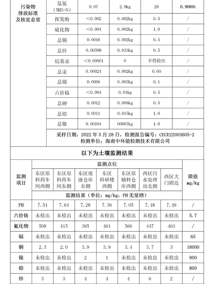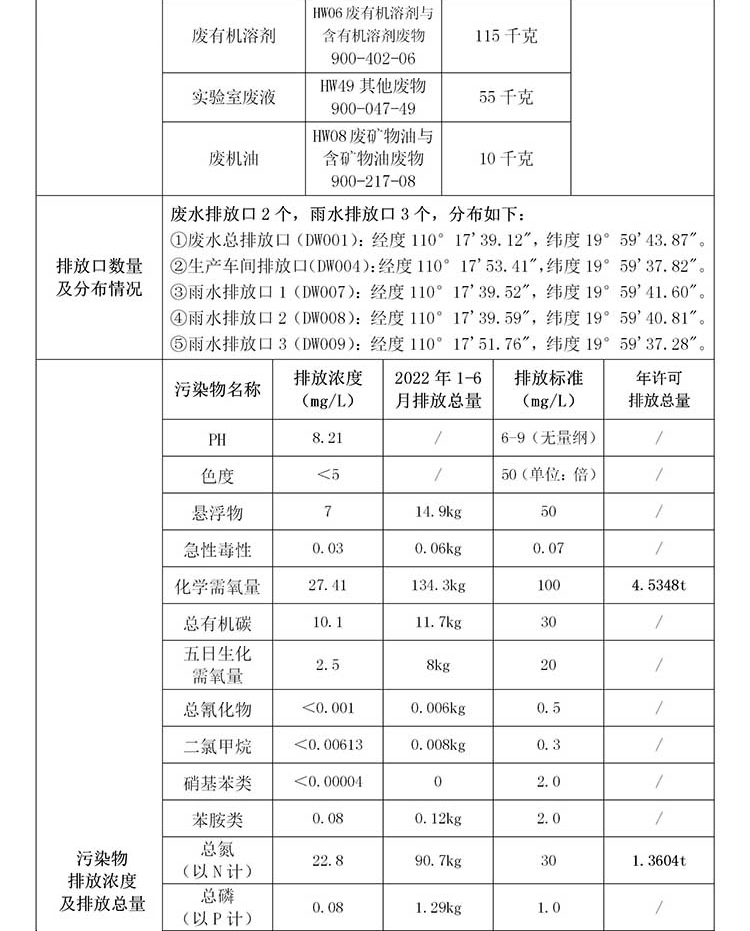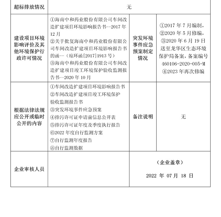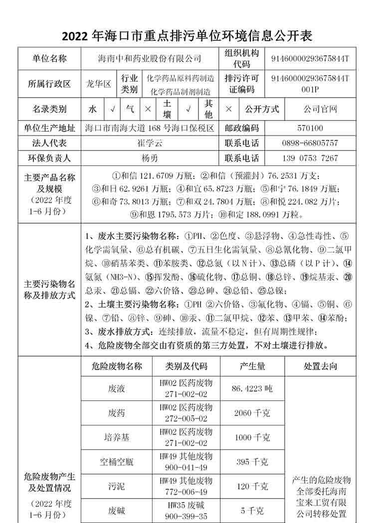 海南中和藥業(yè)股份有限公司2022年??谑兄攸c(diǎn)排污單位環(huán)境信息公開(kāi)表