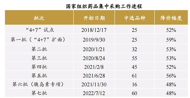 從2018年國家醫保局成立為起點(diǎn),截至 2022 年第二季度末,我國國家組織藥品集中采購已開(kāi)展近5年。5年間,涉及7 批國家組織藥品集中采購,覆蓋 294 種藥品,按集采前價(jià)格測算,涉及金額約占公立醫療機構化學(xué)藥、生物藥年采購額的 35%,一大批常見(jiàn)藥、慢病藥、抗癌藥價(jià)格大幅降低,平均降幅 53%。