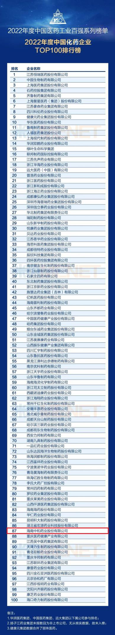 6月27日,2023米思會(huì )在浙江湖州·龍之夢(mèng)國際會(huì )議中心隆重召開(kāi),會(huì )上發(fā)布了2022年度中國醫藥工業(yè)百強系列榜單。海南中和藥業(yè)再度榮登中國化藥企業(yè)TOP100排行榜,位列第87位,較2021年前進(jìn)了3個(gè)名次,并已連續5年蟬聯(lián)此項殊榮。