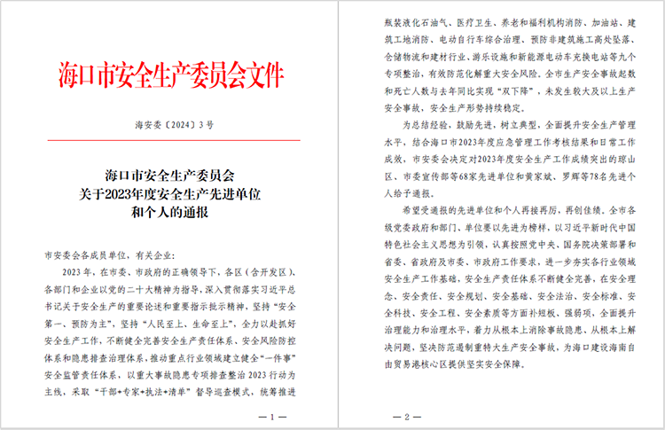 喜報!公司獲評??谑邪踩a(chǎn)委員會(huì )2023年度安全生產(chǎn)先進(jìn)單位