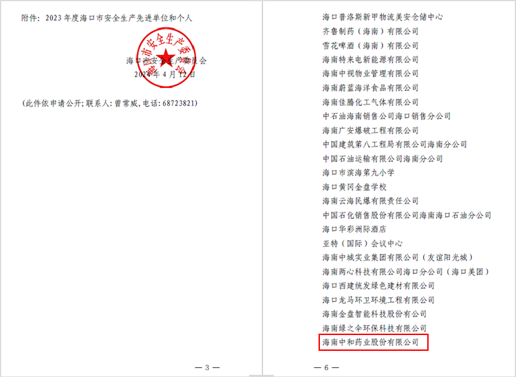 近日,??谑邪踩a(chǎn)委員會(huì )印發(fā)《??谑邪踩a(chǎn)委員會(huì )關(guān)于2023年度安全生產(chǎn)先進(jìn)單位和個(gè)人的通報》(海安委〔2024〕3號),海南中和藥業(yè)股份有限公司獲評安全生產(chǎn)先進(jìn)單位稱(chēng)號。