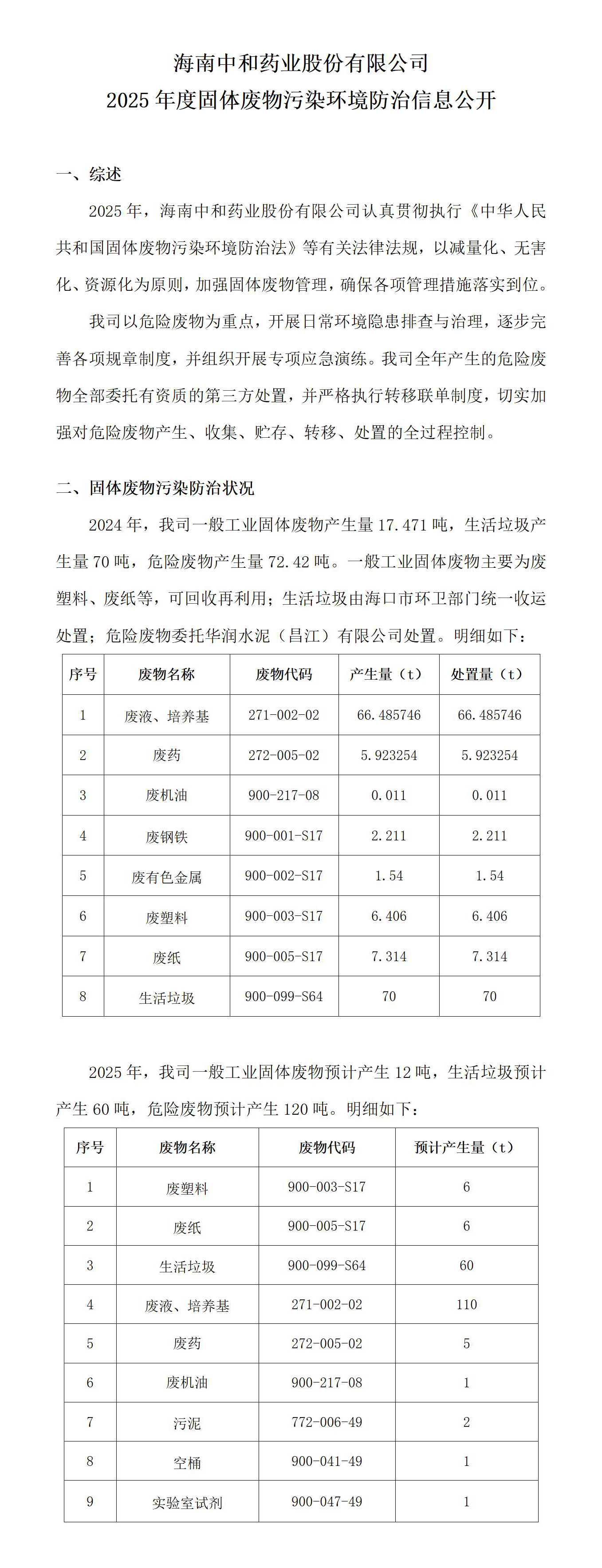 海南中和藥業(yè)股份有限公司固體廢物污染環(huán)境防治信息公開(kāi)(2025年度)