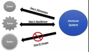 2. 平衡——類(lèi)似于細菌耐藥性發(fā)展過(guò)程,避開(kāi)清除階段的腫瘤細胞基因發(fā)生改變,從而改變細胞表面抗原產(chǎn)物,來(lái)逃避免疫系統的監視。