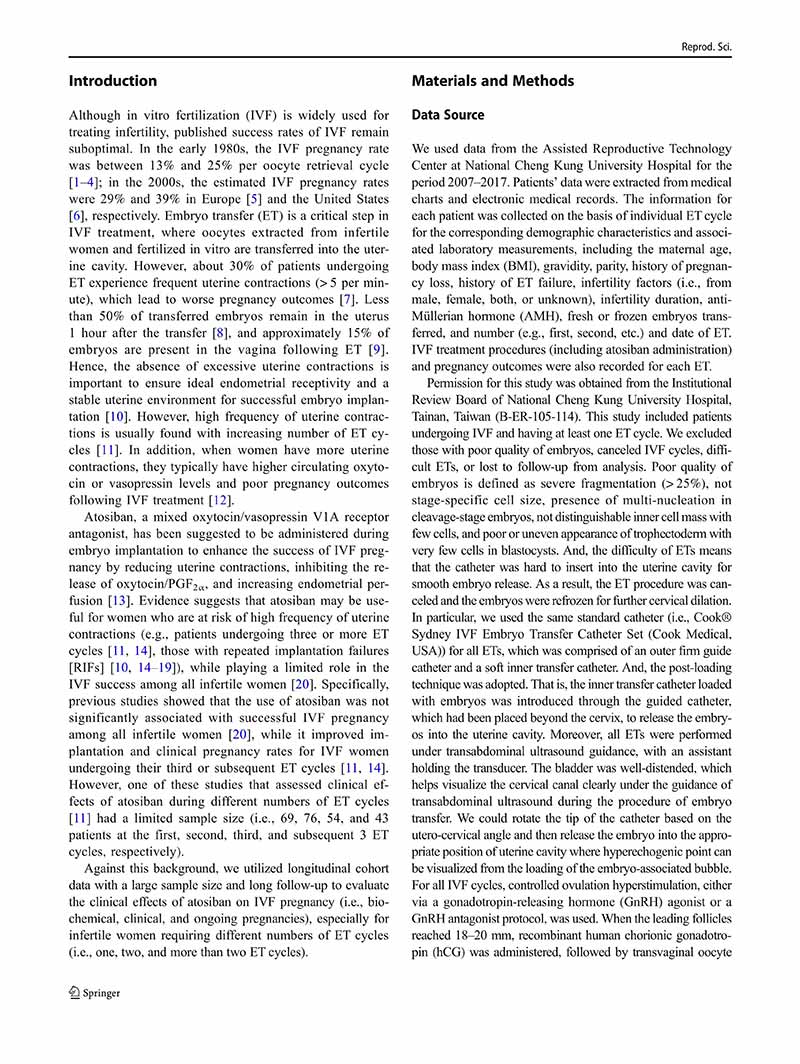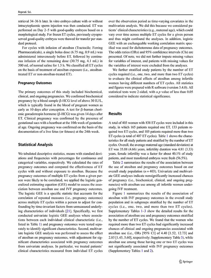 目的:我們評估了在體外受精(IVF)治療后,接受不同胚胎移植(ET)周期(即單個(gè)、兩個(gè)和兩個(gè)以上胚胎移植周期)的不孕婦女使用阿托西班對妊娠結局的影響。
