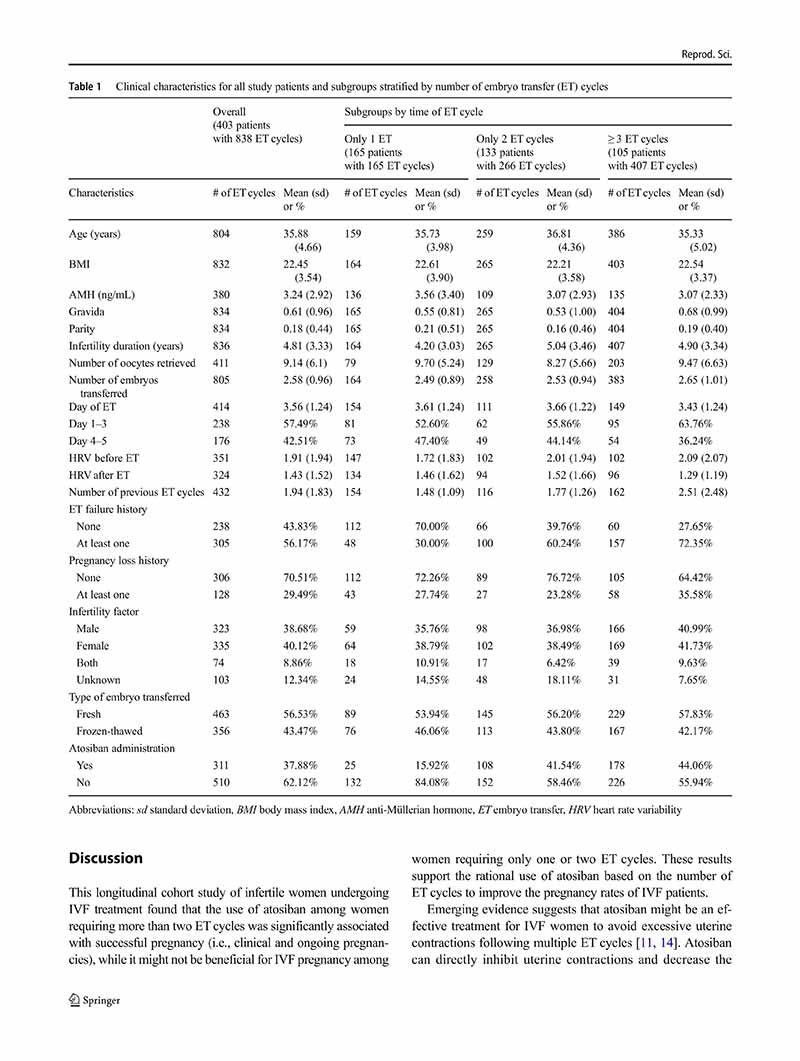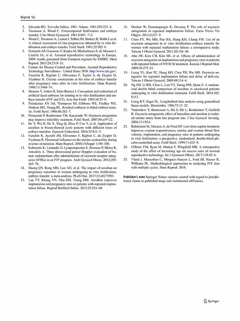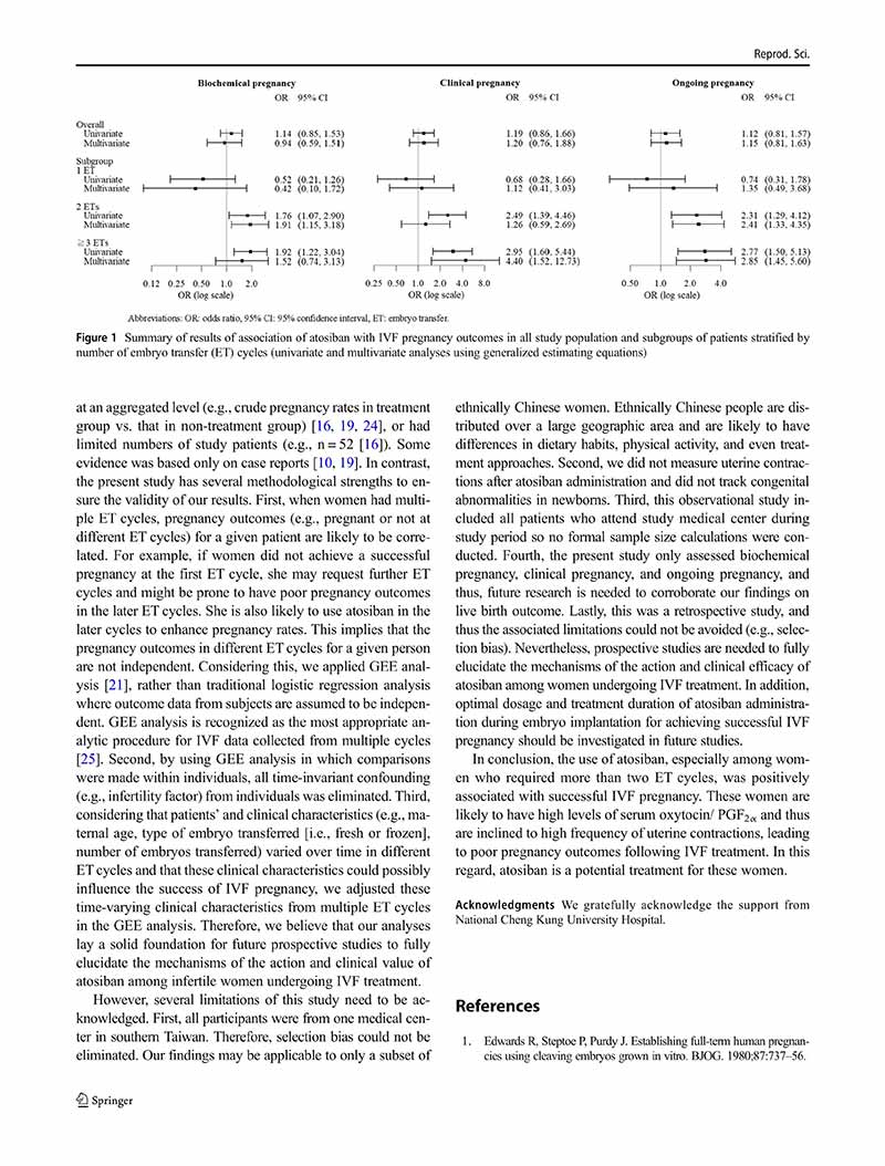 結論:注射阿托西班是一種潛在的提高體外受精妊娠率的治療方法,特別是在需要兩個(gè)以上胚胎移植周期的不孕婦女中。