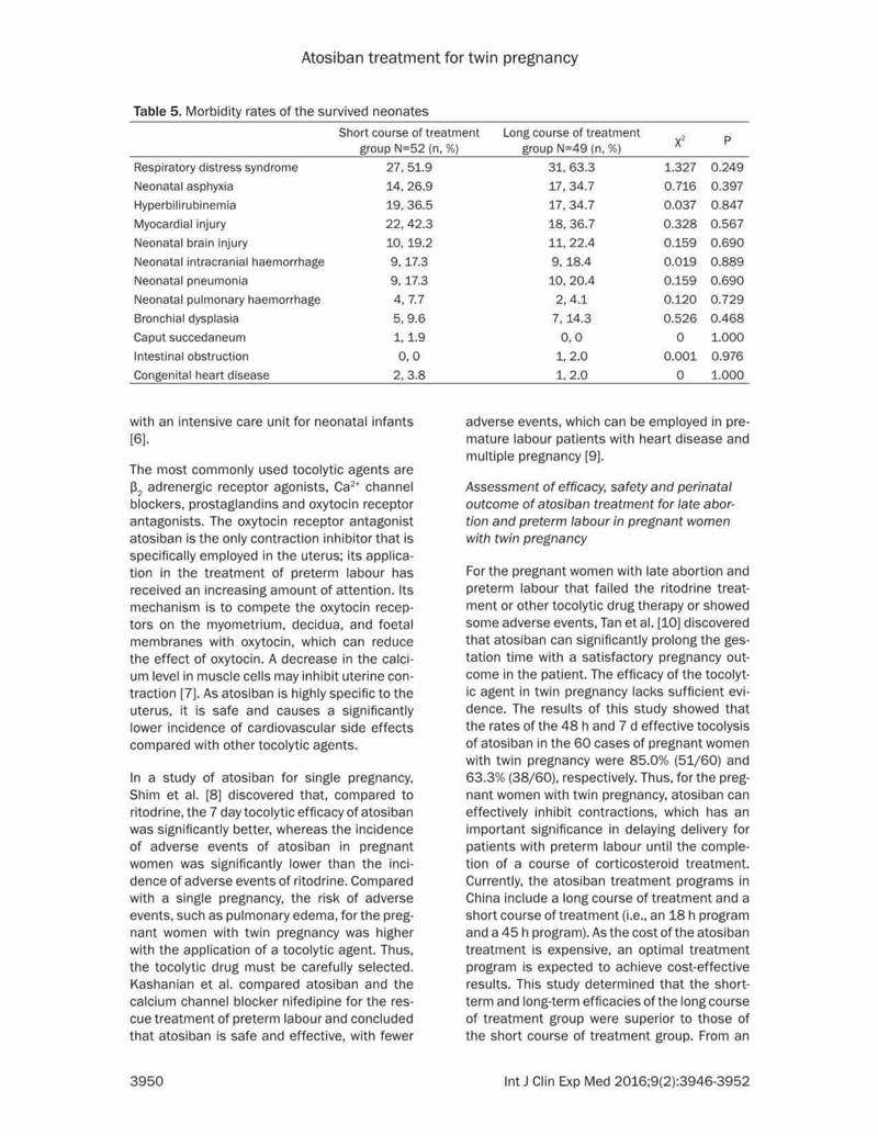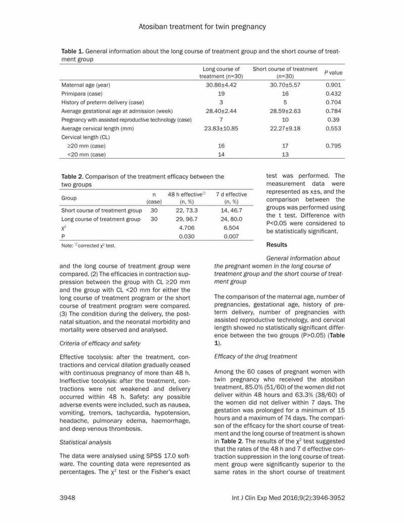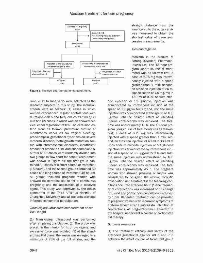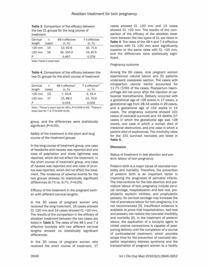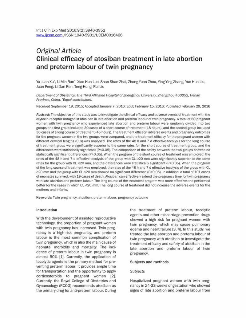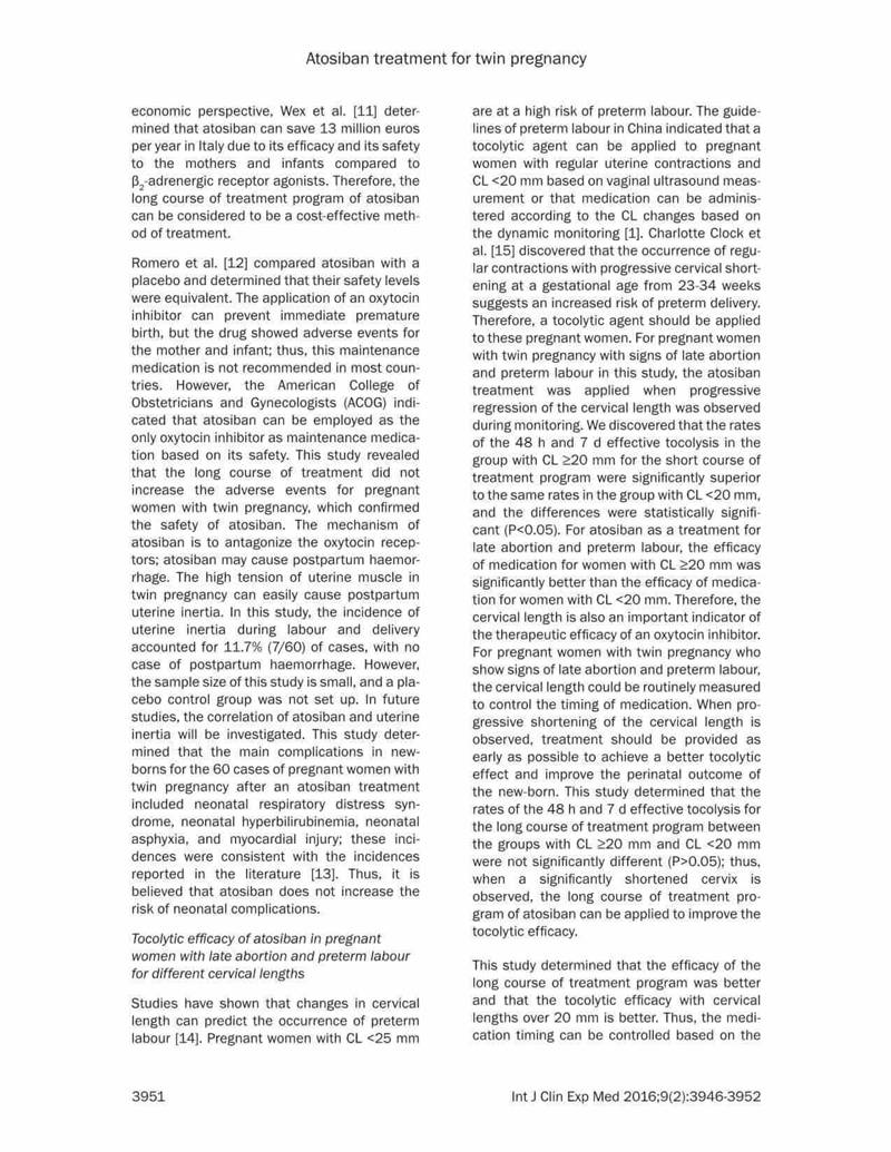 結論:阿托西班可有效延長(cháng)晚期流產(chǎn)以及早產(chǎn)的雙胎妊娠的妊娠時(shí)間。對于宮頸長(cháng)度<20mm的病例,長(cháng)療程治療更有效,效果更好。長(cháng)期治療不會(huì )增加母嬰的不良反應。