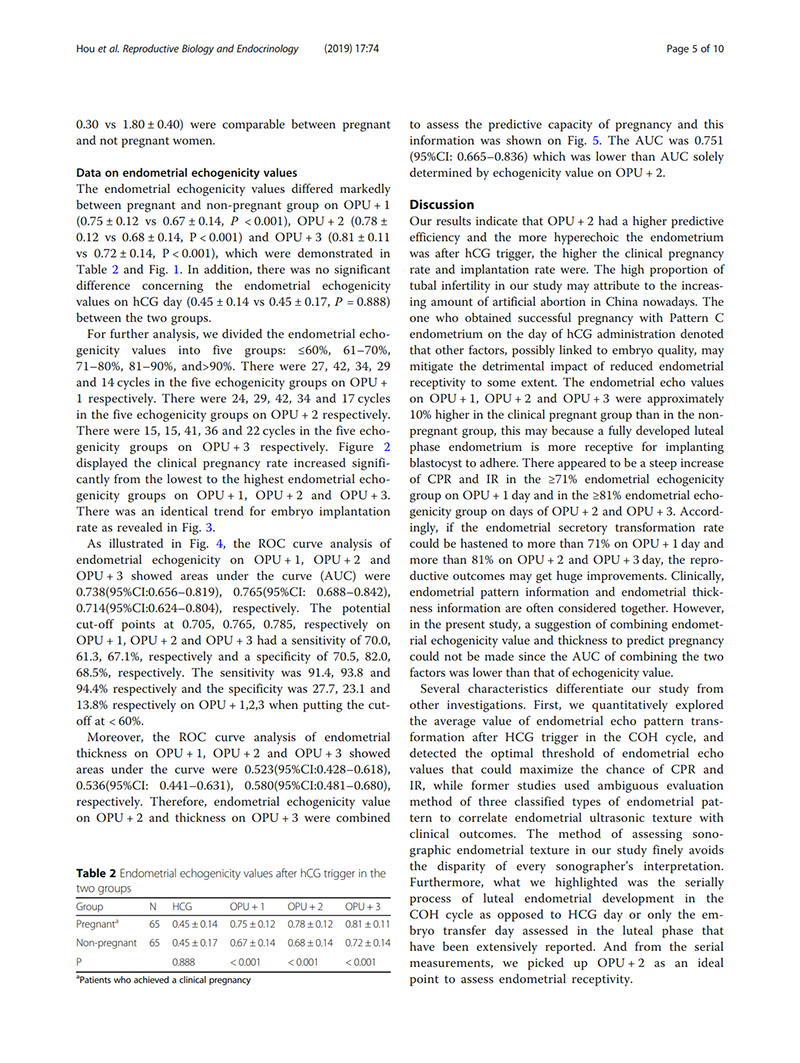 結論:建議用取卵后第2天(OPU+2)的子宮內膜回聲值評價(jià)子宮內膜容受性。當OPU+2的回聲值<60%時(shí),臨床醫生似乎適合提供“全冷凍”IVF周期,并在隨后的凍融胚胎周期中進(jìn)行移植。