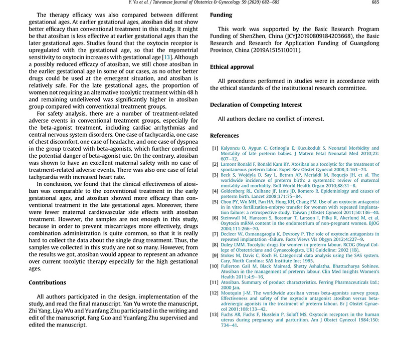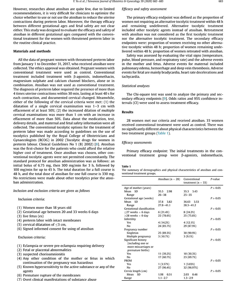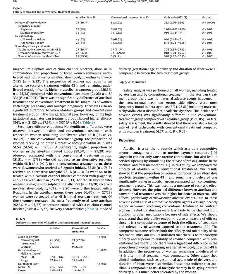 結論:我們的研究結果支持阿托西班對比目前常規治療是更為先進(jìn)的宮縮抑制劑,尤其是對于高孕齡者。